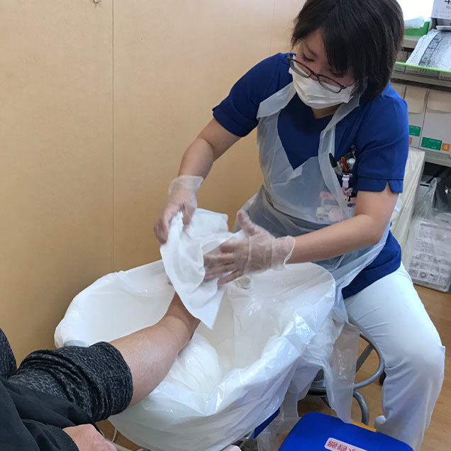 胃ろう周辺の清潔。栄養剤の漏れを受ける(シーツを汚さない)。