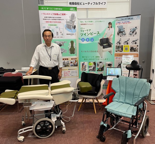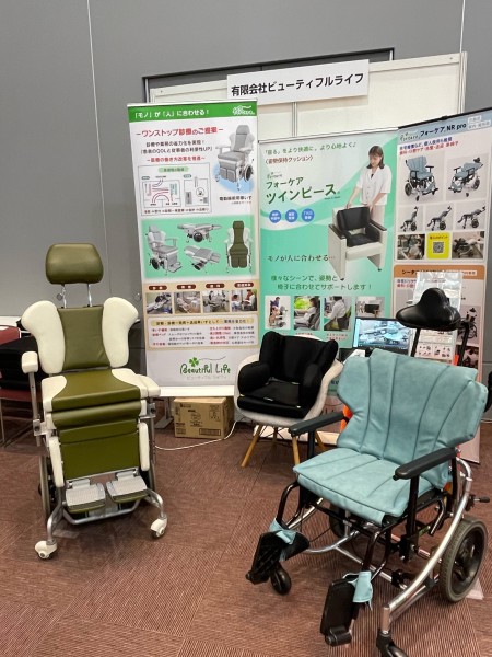 最新の電動施術用車いす(上市前)とフォーケアNRpro(施術用車いす)、フォーケア ツインピース(姿勢保持クッション)及びフォーケアPro&Basic(体圧分散クッション)を展示しました。